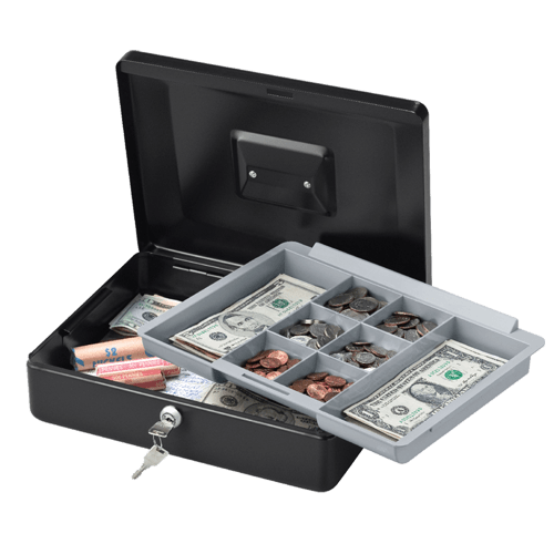 The Master Lock Cash Box has a convenient fold-away handle and removable tray for ease of use. Versatile storage and organization for both home and business.