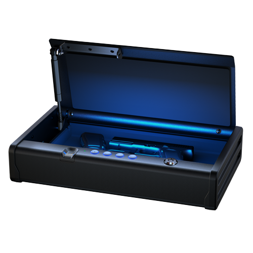 Rated 5 out of 5 by Lewkut from Five Star Safe Absolutely perfect safe for two handguns. I like the blue light on the finger buttons & inside when it opens. Fingerprint to open safe works great. Setting up codes was easy. Great Safe, everyone needs one of these. Very well made.